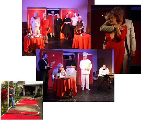 Having disposed of the old set, a new one was built on Bill's drive. This time it had to incorporate a pair of two way swing doors, which thankfully worked a treat in spite of all the heaving about in transit between venues. The simulated Crème Brûlée, (the only food actually served and eaten during the performance) also worked well.